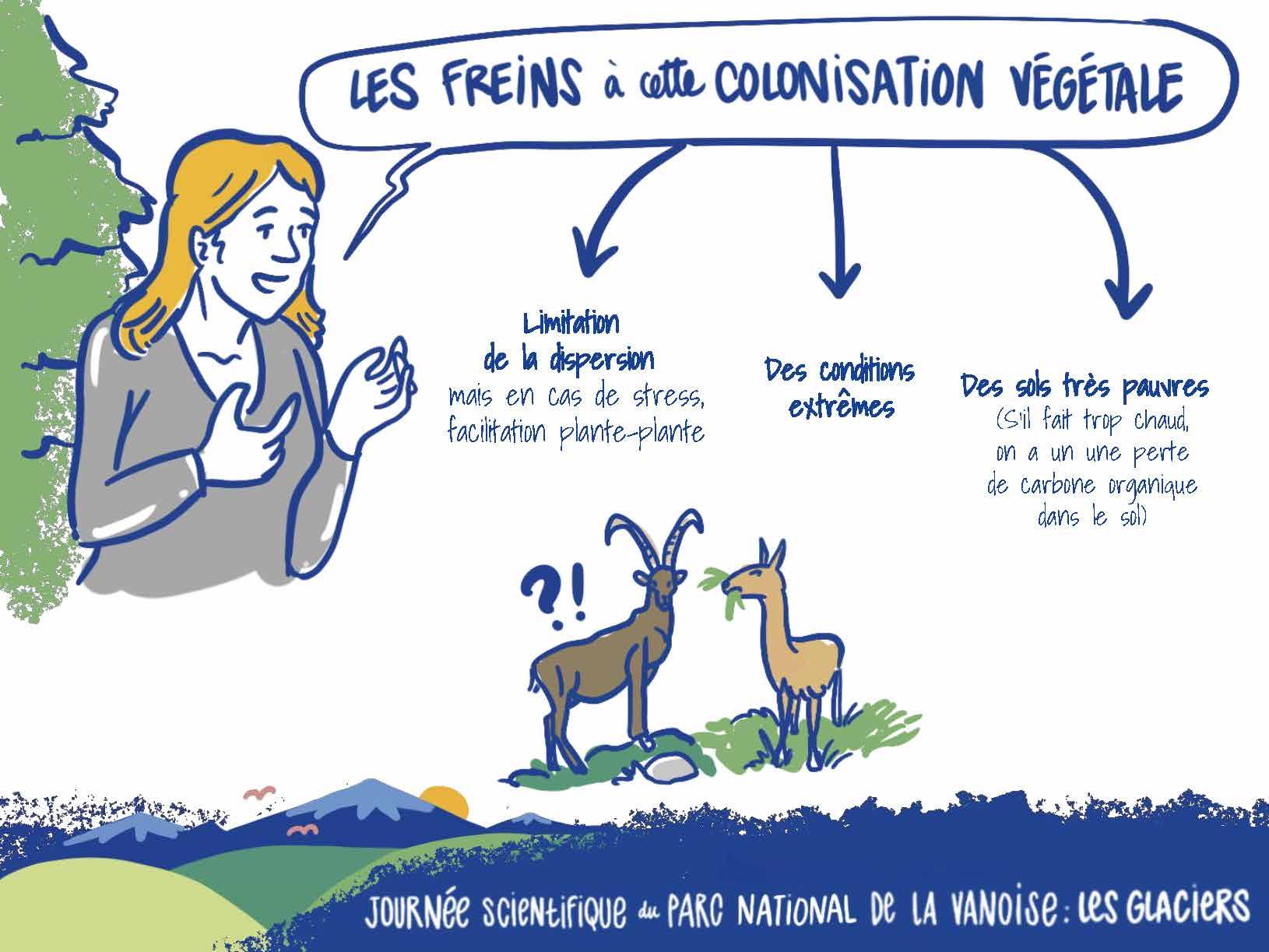 • Entre Alpes (Gébroulaz) et Andes : dynamiques des écosystèmes postglaciaires et enjeux de gestion (Anaïs Zimmer). Différents modes de dispersion permettent aux végétaux de coloniser les écosystèmes postglaciaires. Des études ont été réalisés sur Gébroulaz et d’autres massifs montagneux pour comprendre ce qui limite cette dispersion mais aussi ce qui peut la faciliter, comme les interactions de facilitation entres espèces végétales ou la présence de faune.