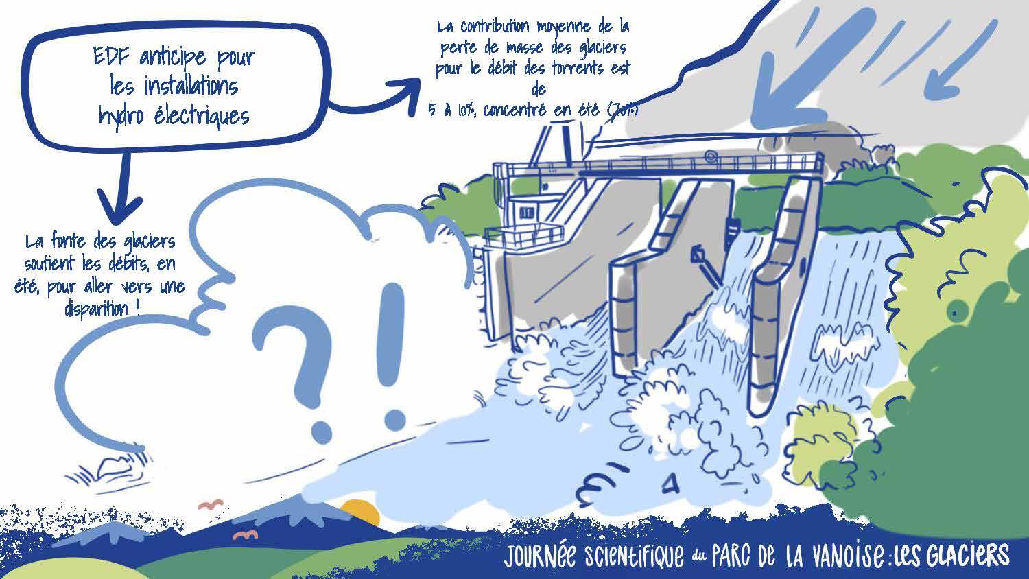 • Apport des études sur Gébroulaz à la modélisation hydrologique (Matthieu Le Lay, EDF). Un partenariat IGE/EDF pour déterminer l’évolution du glacier et sa contribution future en ressource en eau, en lien avec la résilience au changement climatique des projets de production hydroélectrique. Le recul du glacier va progressivement réduire sa contribution en eau au Doron des Allues, qui est majoritaire en été avec une baisse possible d’environ 70% des débits d’étiage2 d’ici la fin du siècle.